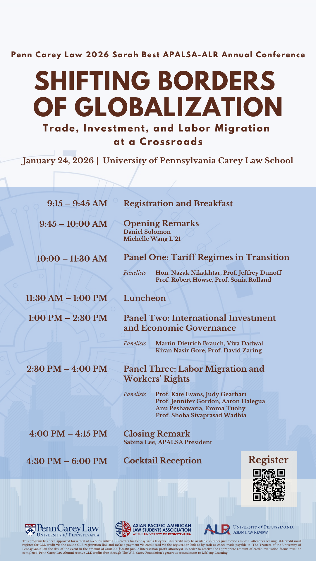 This program has been approved for a total of 4.5 Substantive CLE credits for Pennsylvania lawyers. CLE credit may be available in other jurisdictions as well. Attendees seeking CLE credit must register for CLE credit via the online CLE registration link and make a payment via cash or check made payable to “The Trustees of the University of Pennsylvania” on the day of the event in the amount of $180.00 ($90.00 public interest/non-profit attorneys). In order to receive the appropriate amount of credit, evaluation forms must be completed.